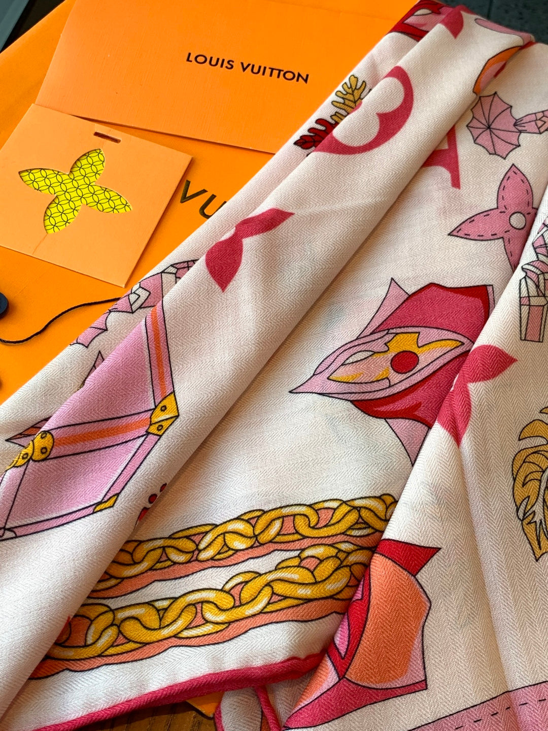 LV Scarf 135cm Pink White Cashmere Mulberry Silk 976765