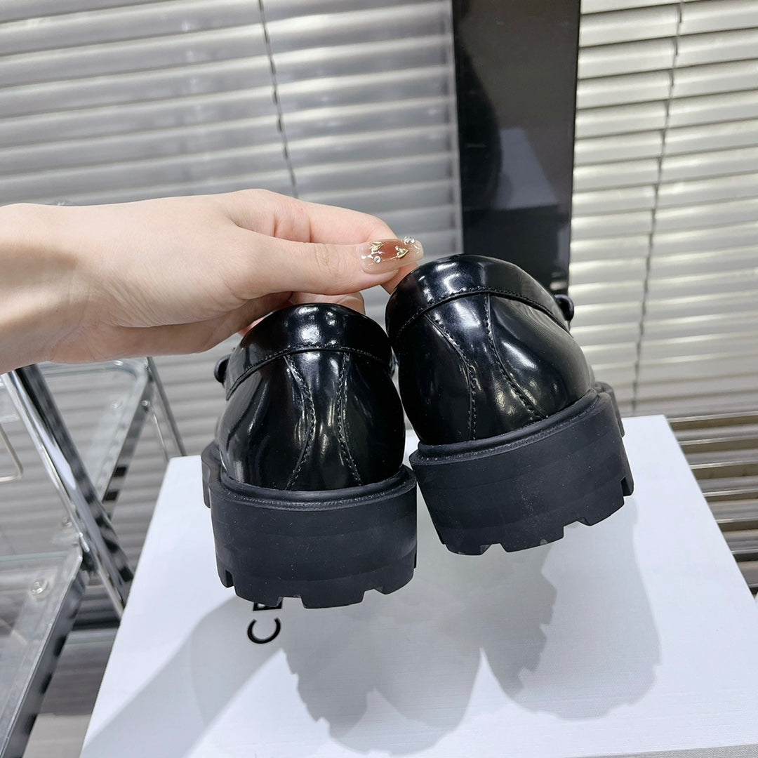 MARGARET CHUNKY LOAFER WITH FRINGES AND TRIOMPHE CHAIN IN POLISHED BULL GLOSSY BLACK
