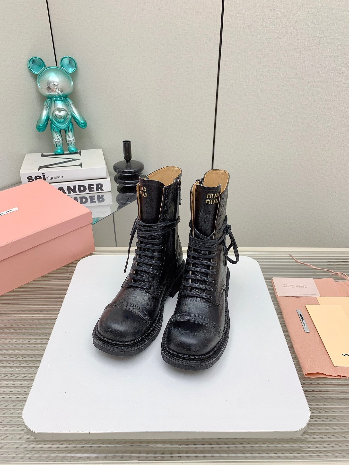 Miu Leather Laced Booties Black Cowhide
