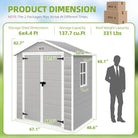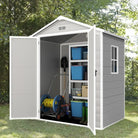 This outdoor resin shed offers a weather-resistant and secure storage solution for garden tools, patio gear, bicycles, and more. Designed with a spacious 6x4.4ft interior, it features waterproof and UV-resistant resin walls, a sloped roof to prevent water buildup, and lockable double doors for added security.
