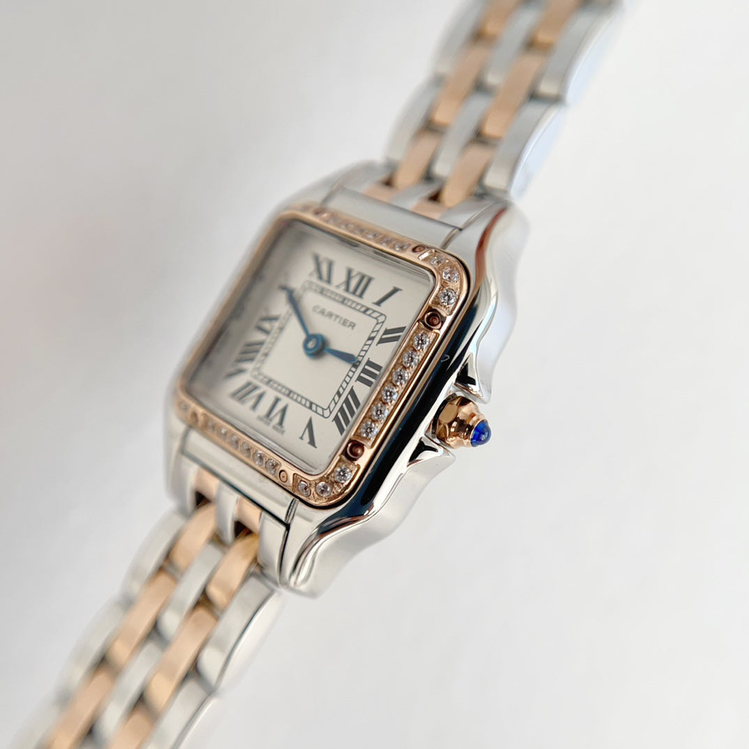Panthere 22mm Pink Gold Silver Diamond Bezel Double Chain 44cm