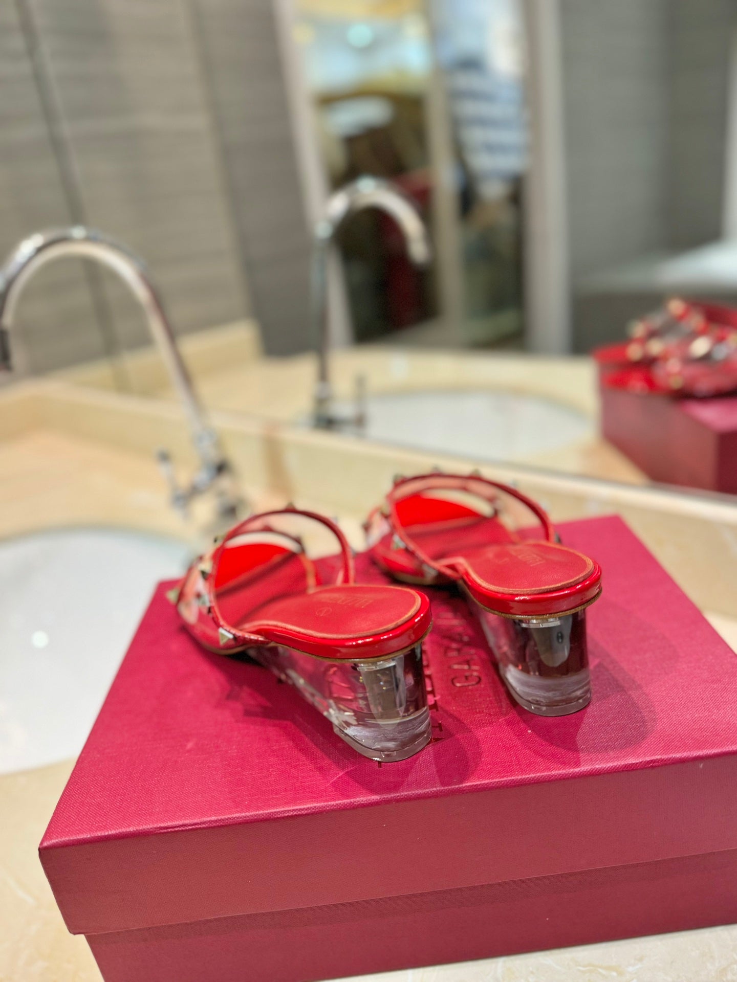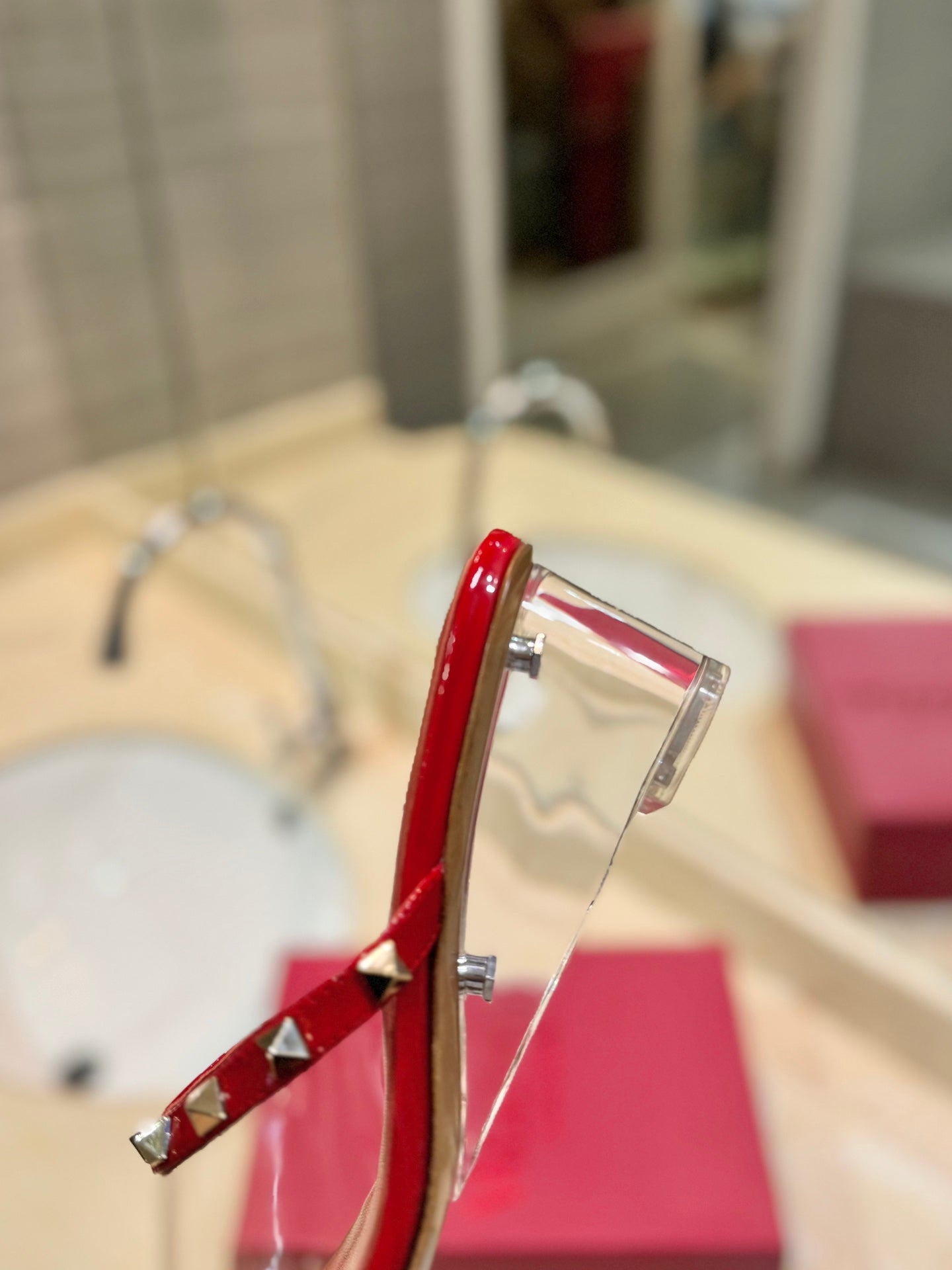 ROCKSTUD MULE SANDALS IN CHERRY RED CALFSKIN AND TRANSPARENT PVC FILM