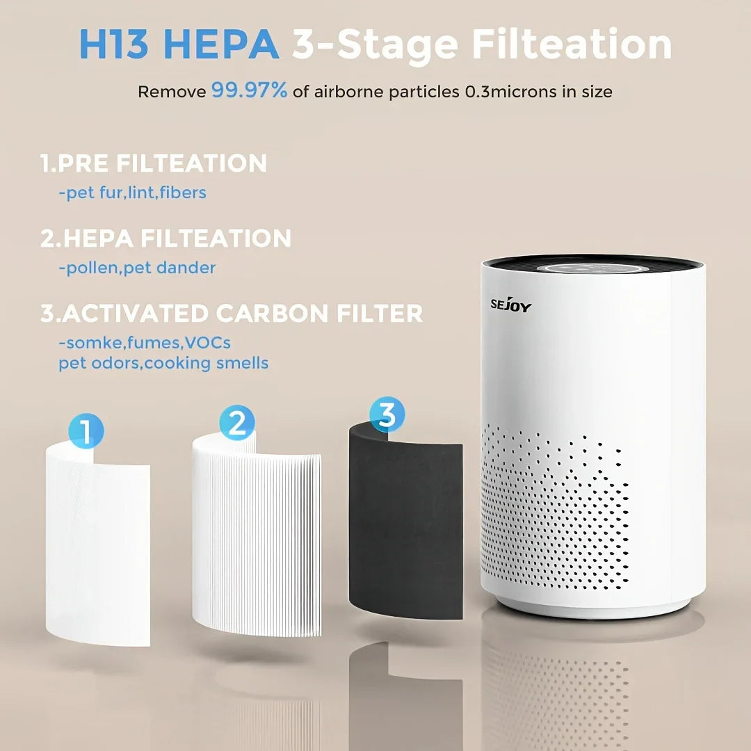 Featuring an advanced filtration system, the SEJOY Air Purifier captures up to 99.97% of airborne pollutants, including dust, pollen, pet dander, and smoke. The activated carbon filter helps eliminate household odors, making it ideal for bedrooms, living rooms, and office spaces.