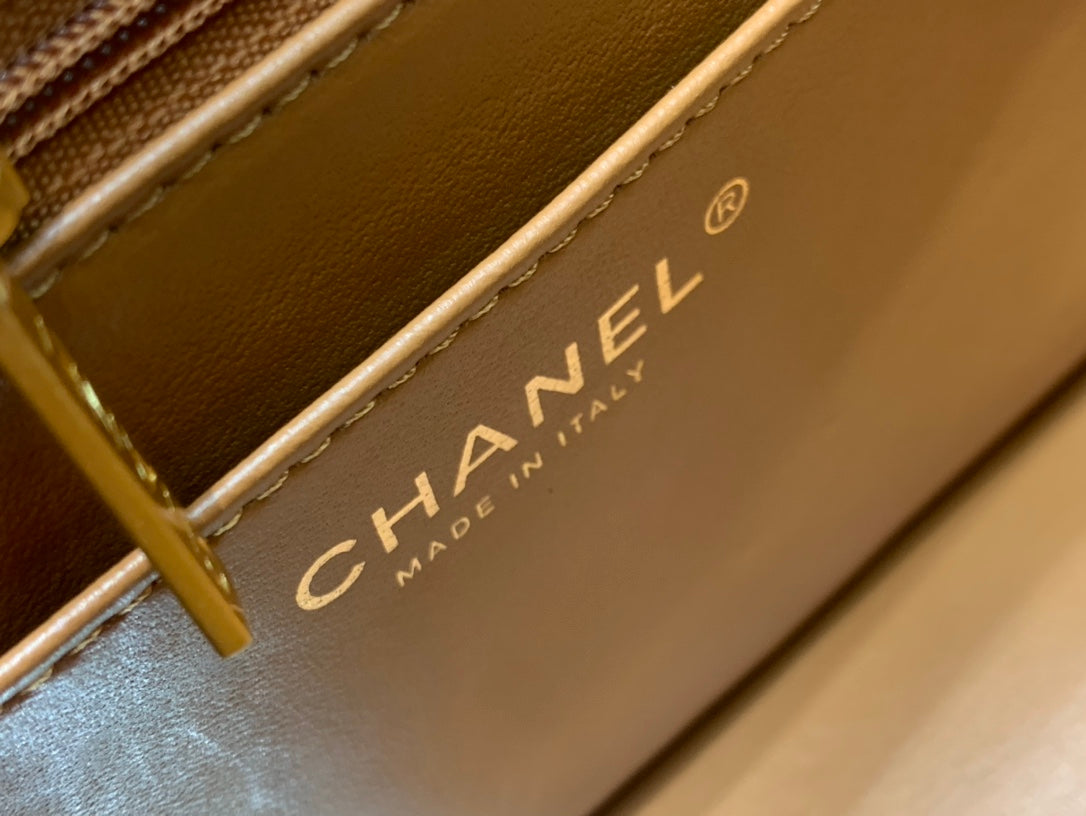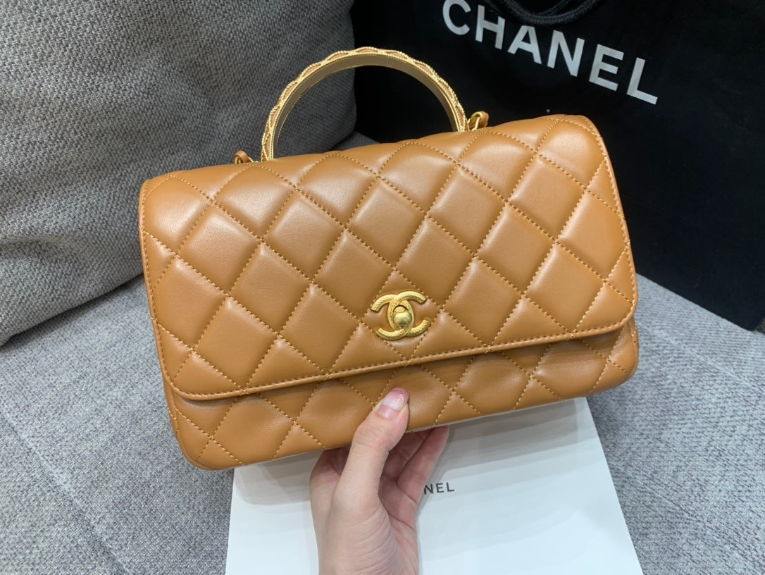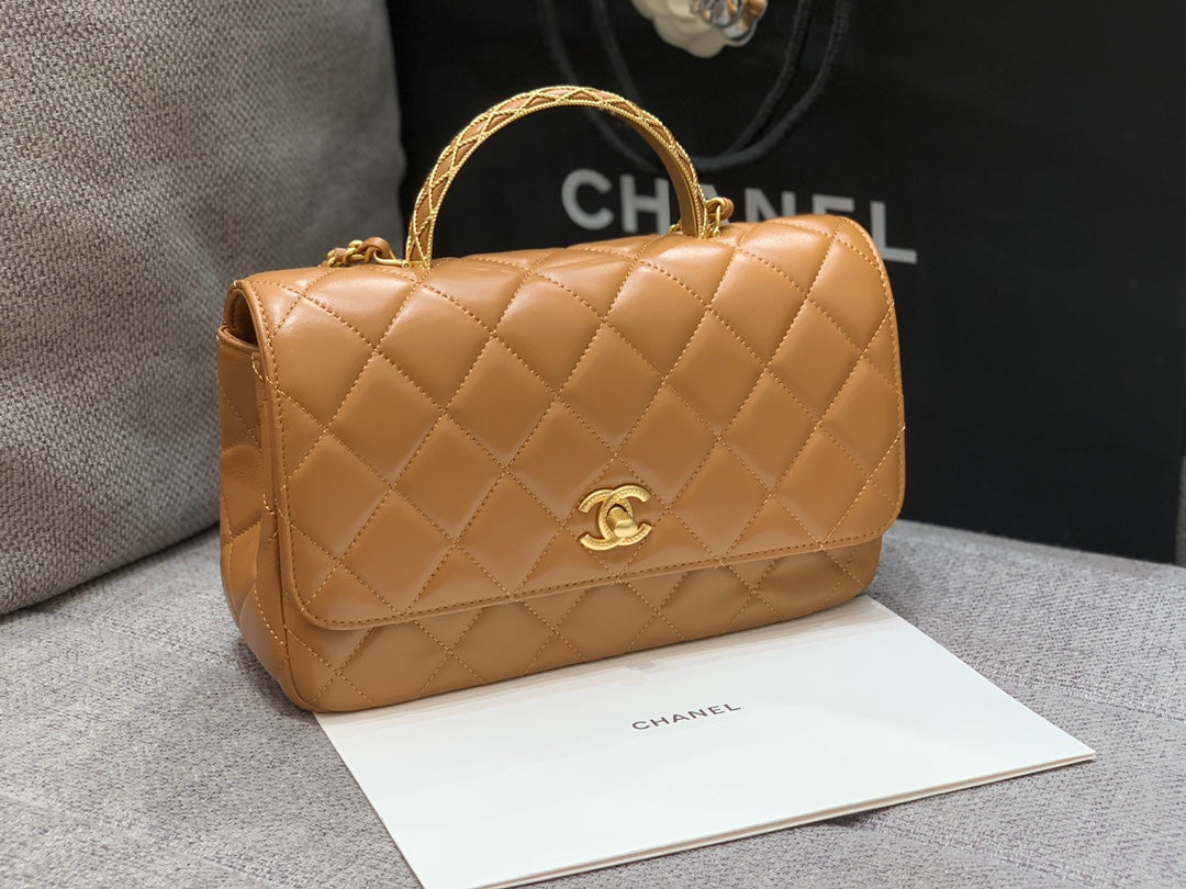 SMALL FLAP BAG 24CM TOP HANDLE BROWN LAMBSKIN GOLD HARDWARE