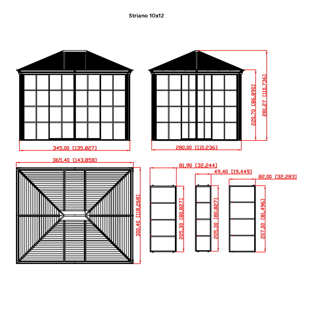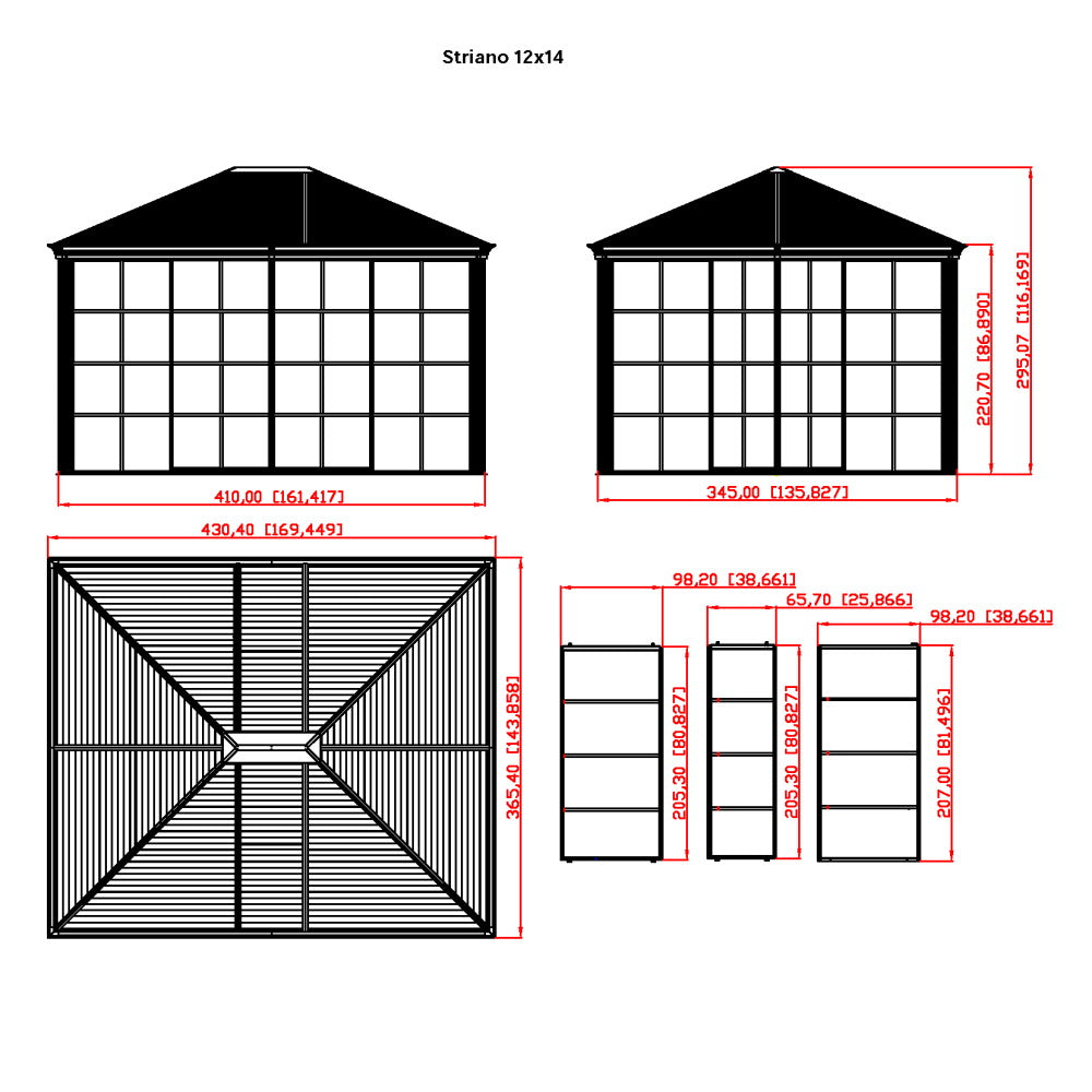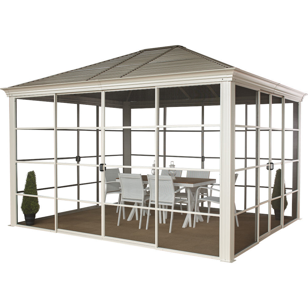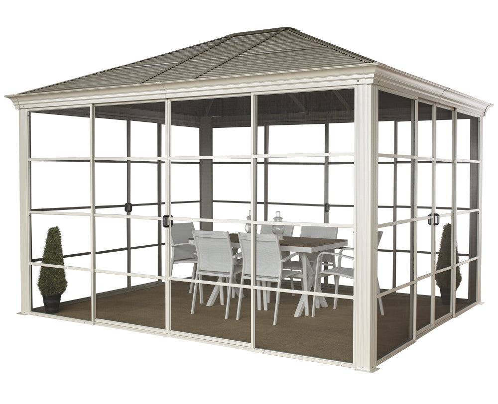 Create the perfect outdoor space with the Striano screen house. This beautiful screen house boasts double sliding doors on all 4 sides of the aluminum structure, along with a galvanized steel roof. It features wall-to-wall screens, which allow you and your loved ones to enjoy eating or relaxing outside without pesky bugs.