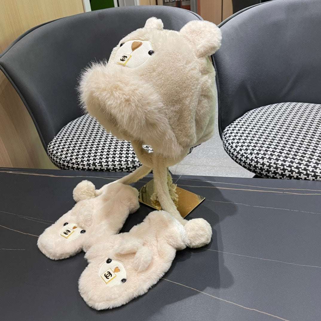 • Three-Piece Set for women, featuring a cute bear-shaped plush hood, scarf, and gloves, ideal for autumn and winter.