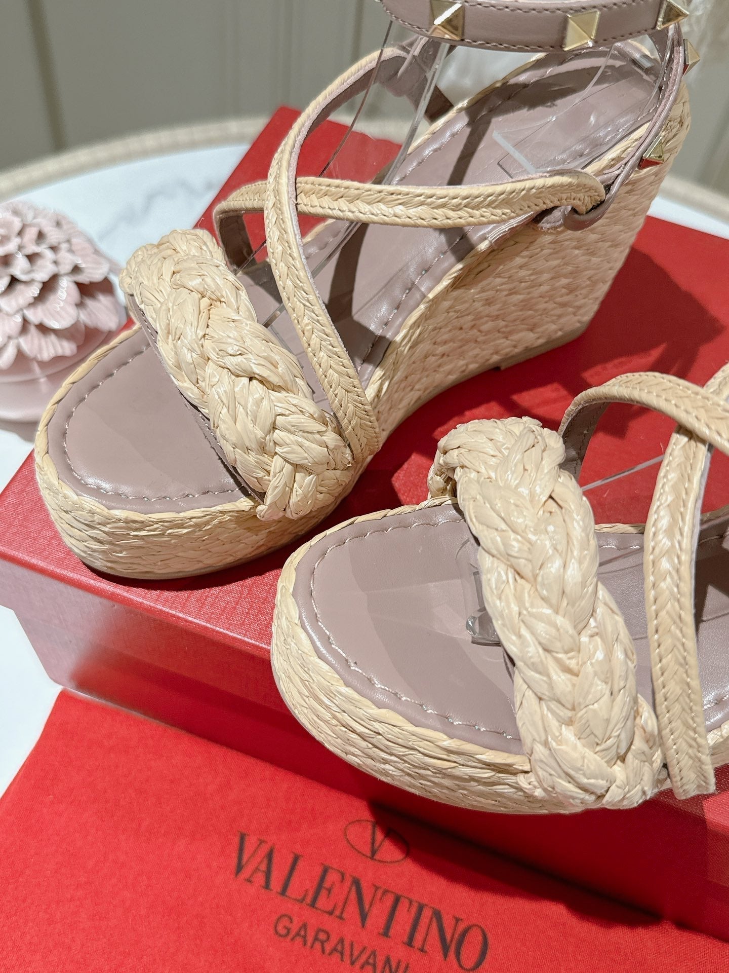 Valentino Garavani Taupe Wedge Rockstud Sandals 10mm In Rosy Brown Calfskin And Beige Raffia 829386